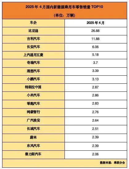 乘联分会数据显示,4月,国内新能源乘用车零售销量突破2万辆的品牌共计16家,销量排名前十的品牌分别为比亚迪(26.88万辆)、吉利汽车(11.88万辆)、长安汽车(6.06万辆)、上汽通用五菱(5.18万辆)、奇瑞汽车(3.7万辆)、理想汽车(3.39万辆)、小鹏汽车(3.13万辆)、特斯拉中国(2.87万辆)、小米汽车(2.86万辆)和零跑汽车(2.83万辆)。