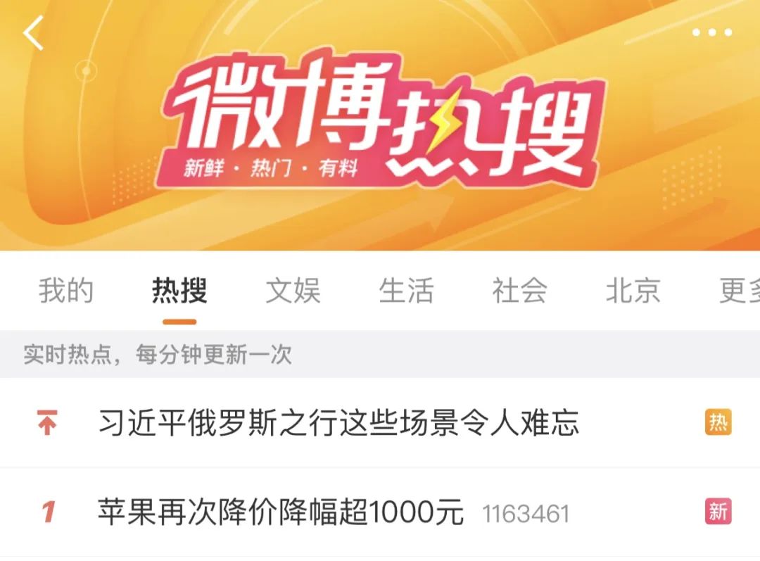 5月11日,“苹果再次降价降幅超1000元”的话题登上微博热搜第一位。