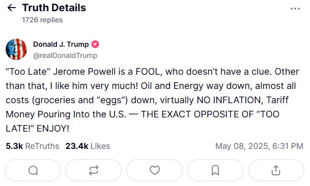 在美联储维持利率不变的决策后,他在自己的社交平台Truth上发文称:"'为时已晚'的杰罗姆·鲍威尔是个傻瓜,他一无所知。"他宣称"几乎没有通胀"——这在3月确实如此,当时美联储首选的通胀指标显示当月没有变化。