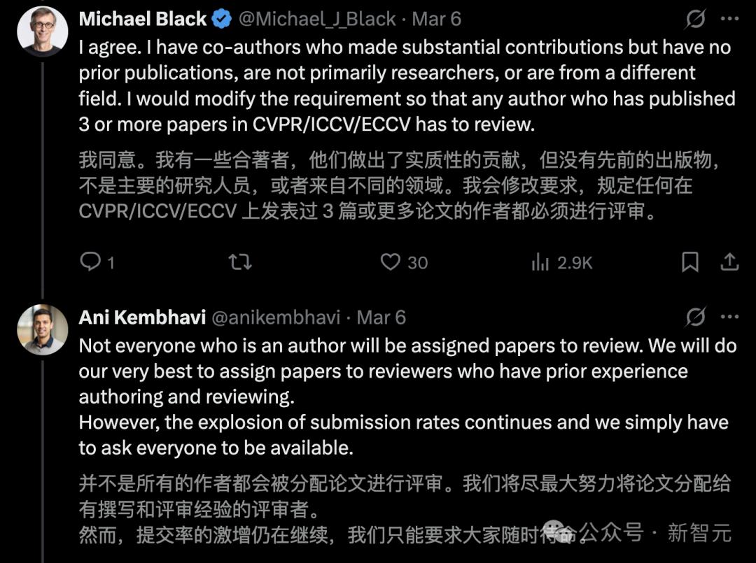 马克斯·普朗克研究所主任Michael Black非常认同,他表示会修改要求,让任何在CVPR/ICCV/ECCV发表过3篇以上论文作者必须参与评审。