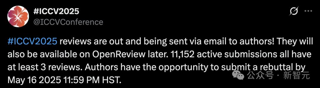 作者可以在5月16日晚上11:59(夏威夷时间)前提交rebuttal,ICCV 2025将于6月25日公布最终录用决定。