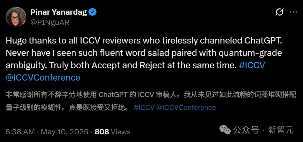 Pinar表示,「真诚感谢「辛勤」工作的ICCV审稿人,你们怕不是直接把ChatGPT的结果复制粘贴上来了!这行云流水般的胡言乱语,配上量子级的模棱两可,同时接受和拒绝,简直是薛定谔的审稿意见。」