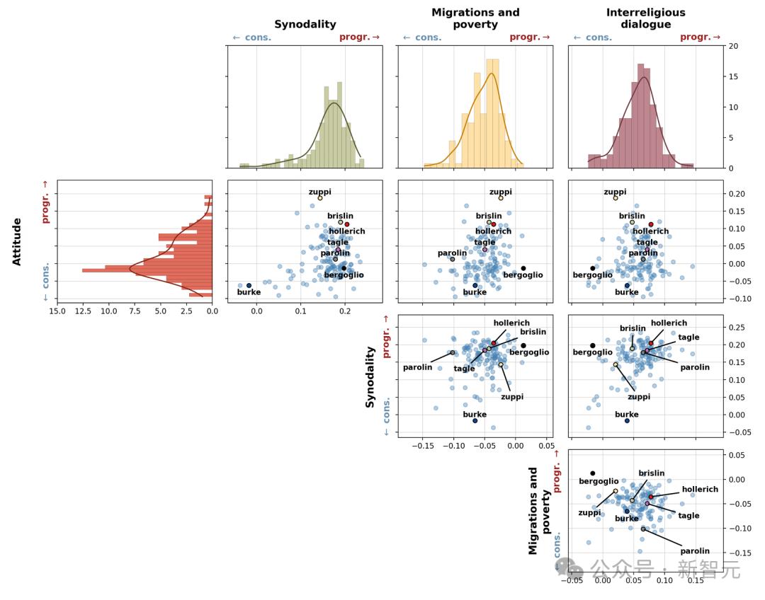 然后把每个红衣主教的议题段落和这两个参考文本进行交叉编码,通过计算相似性分数的差值,就能判断出每个红衣主教在这个议题上更倾向于进步还是保守。