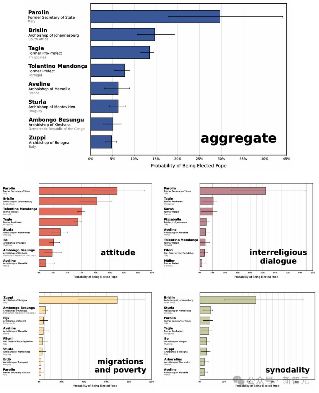 结果模型给出的预测是意大利红衣主教Pietro Parolin,而当选的Prevost(利奥十四世)压根不在它的预测名单里!