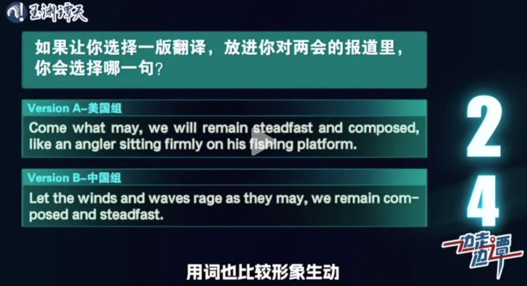 美国组的结果保留了钓鱼台的意象,用了英文俗语「come what may」来替代风浪,翻译地道,表意准确;中国组则相反,保留了风浪意象但没有直译钓鱼台,而是用「remain composed and steadfast」来传达泰然自若的姿态,强调了隐喻背后的内涵。