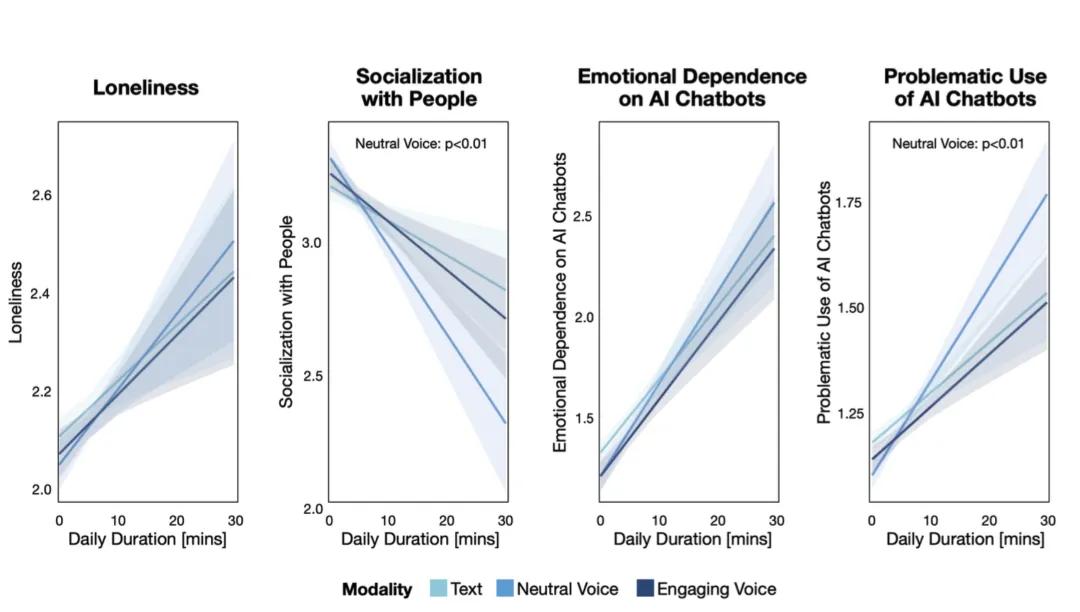 (澄清: 不是说使用聊天机器人直接导致更加孤独,而是说那些愿意和聊天机器人进行私密谈话的用户,在生活中普遍感到更孤独。进而, 聊的越久、越深,用户的社交失能情况越明显。)