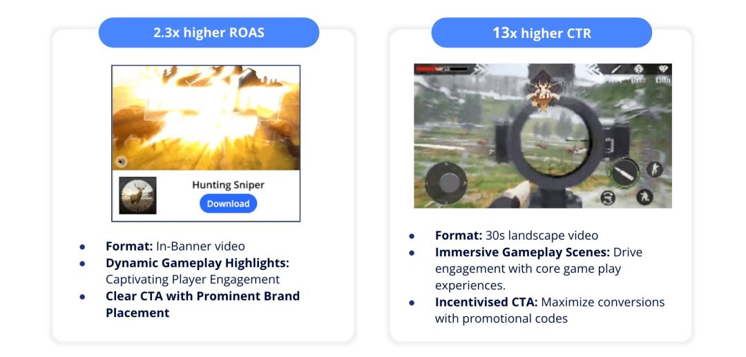 首先体现在投放上。该机构表示,通过动态展示游戏亮点+突出品牌+明确的CTA(行动号召,即有效引导用户作出点击动作)的横幅视频广告,ROAS(广告支出回报率)提高了2.3倍,用户参与度大大提升;还有就是呈现沉浸式游戏场景的30s横向视频,能将点击率提升13倍,再结合促销码之类的激励性CTA,可进一步将转化率最大化。