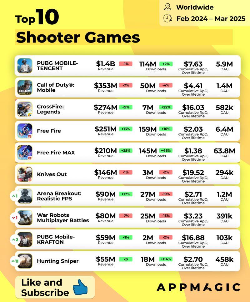 《Hunting Sniper》在2023年上线,这一年Q4创造了近2000万元(即270万美元)的营收,当时看来只能说前景不错;自2024年起,游戏开始真正发力,几乎一直保持在美国iOS动作类游戏免费榜TOP50,收入也持续上涨,且IAP收入增速超过下载量增速,到2025年Q1营收已经突破了1亿元(即1540万美元),算是爆款之作了。