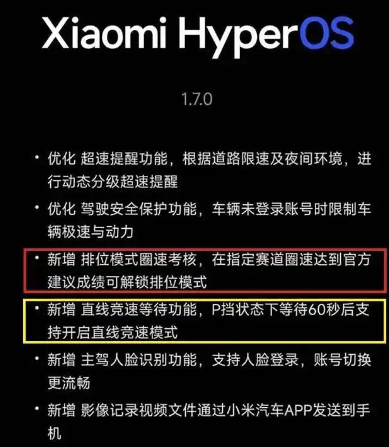 5月1日,多名小米SU7 Ultra车主通过社交媒体对外表示,其购买的小米SU7 Ultra的车机系统通过OTA升级至Xiaomi HyperOS 1.7.0版本,此次升级除了对一些功能进行优化外,最大的变化是增加了“排位圈速考核功能”。