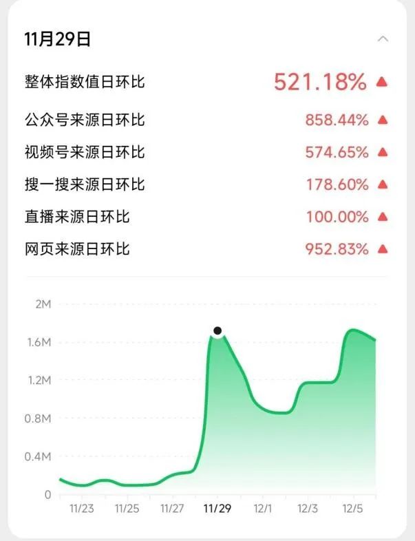 根据微信指数的数据显示,在2024年11月29日节目上线后的第二天,谢添地整体指数值日环比暴涨521.18%,创造了又一个综艺营销的经典案例。