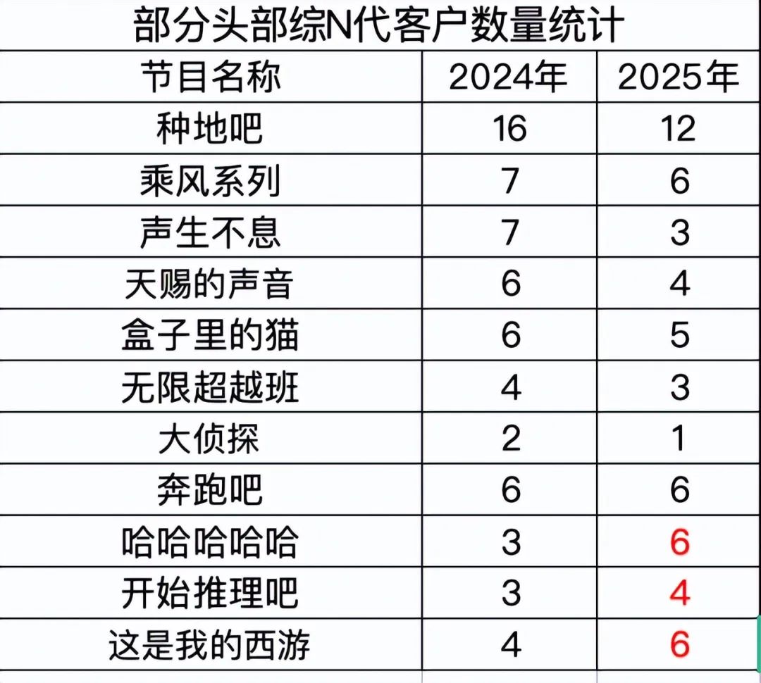 娱乐独角兽统计了2025年11档已播头部综N代的招商情况,有7档节目的招商数量与去年相比是下降的,其中不乏像《种地吧》《乘风》这类招商“神兽”。《奔跑吧9》在原阵容+奔跑挚友孟子义、李昀锐加入的情况下,保持了与去年同样的客户数量;仅“五哈5”“开推3”“西游”(《这是我的岛》第二季)3档节目的招商数量有所上升。