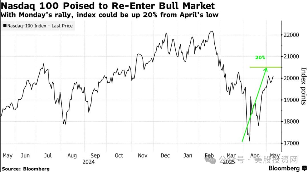 纳斯达克100指数自4月低点以来累计反弹接近20%,逼近技术性牛市门槛。按照市场通行定义,若指数自近期低点反弹幅度达到或超过20%,即被视为重新进入牛市区间。