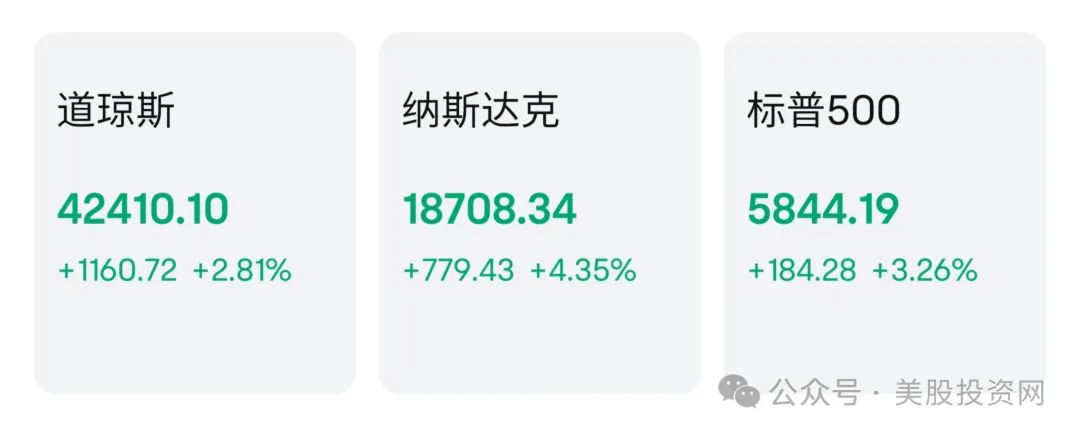截至收盘,美股三大股指均创下自4月9日以来的最大单日百分比涨幅。道指涨幅为2.81%,;纳指涨幅为4.35%;标普500涨幅为3.26%。