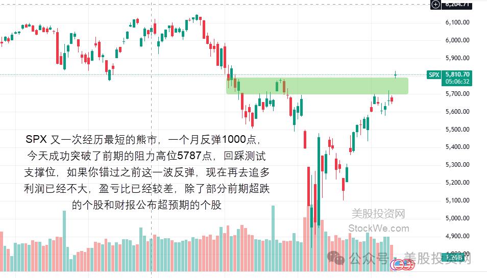 美股投资网分析认为,SPX今天成功突破了前期的阻力高位5787点,回踩测试支撑位,如果你错过之前这一波反弹,现在再去追多利润已经不大,盈亏比已经较差,希望等部分个股回调再入 。