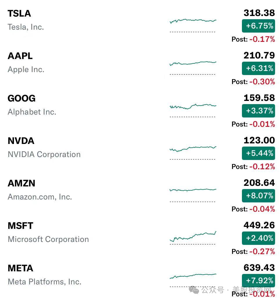特斯拉股价上涨近 7%,市值再次突破 1 万亿美元。其中,苹果上涨6.31%,亚马逊涨8.07%,英伟达涨5.44%,微软涨2.4%,谷歌母公司Alphabet的A类股上涨3.74%。