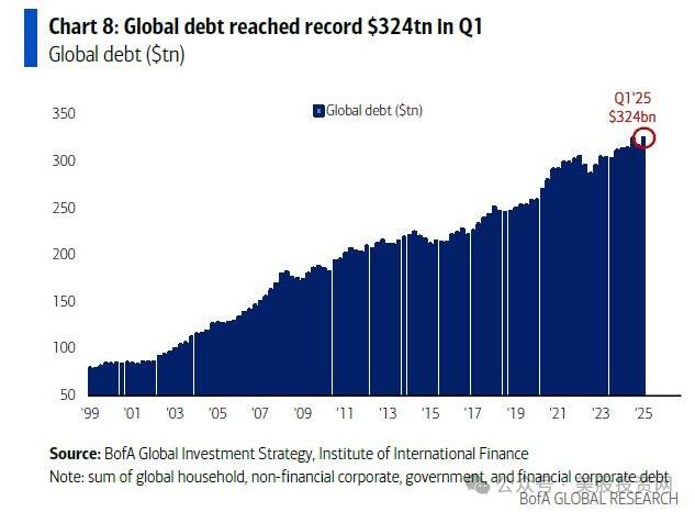 换句话说,如果市场不再愿意买入长期国债,导致利率飙升,就可能引发债务链条的压力。正如下图所示,今年第一季度全球债务总额已创下历史新高——达到324万亿美元。在这种背景下,债券投资者集体“罢买”只是迟早的事。