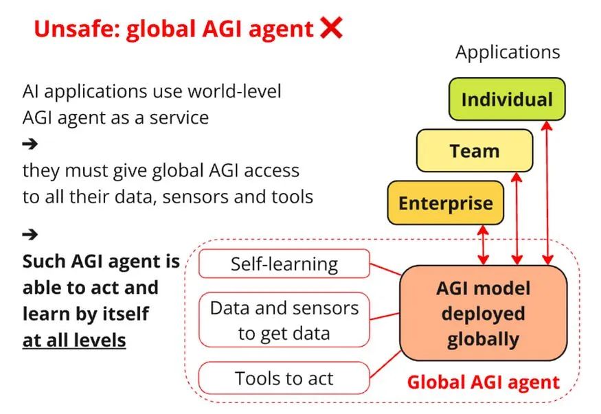 这种设计的危险在于AGI代理在全球范围内运行,而特定的应用程序仅仅将其用作一种服务。