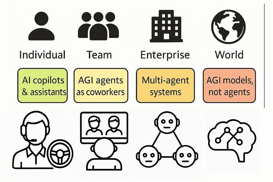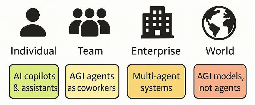 对于组织范围的应用程序(例如整个企业信使、完整的问题跟踪器或 ERP 平台),AGI 应该采用团队级代理的形式,即多代理系统。