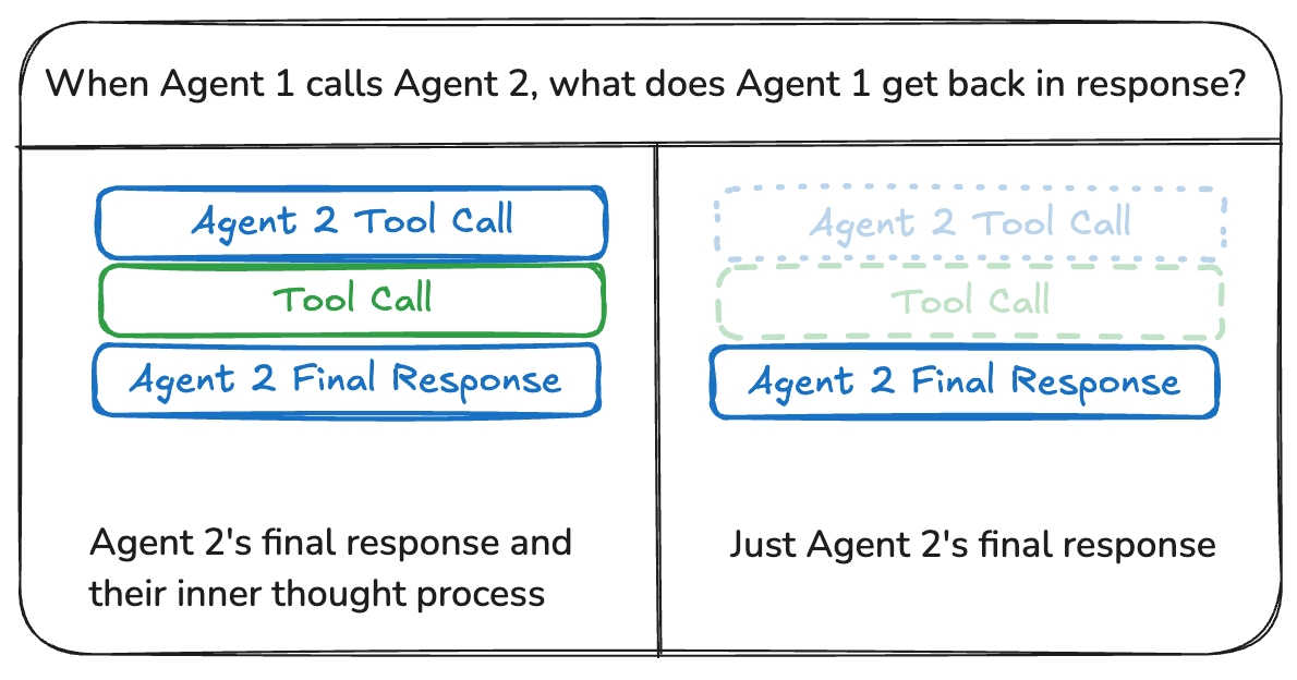 智能体共享完整思维过程(即" scratchpad "),通常表现为消息列表。优势是帮助其他智能体做出更好决策,提升系统整体推理能力。缺点是随着复杂度增加需要额外内存管理策略