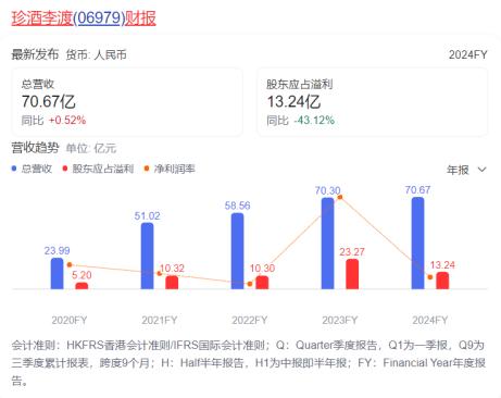 经营业绩上,珍酒李渡在上市的第二个财年出现了营收几近停滞,净利大幅下滑的情况。财报数据统计,珍酒李渡2024财年营业收入达到70.67亿元,同比微增0.5%;归母净利润却大幅下滑43.1%,降至13.24亿元,主要受非经营性金融工具公允价值变动的影响。若经调整,净利润为16.8亿元,同比增长3.3%。