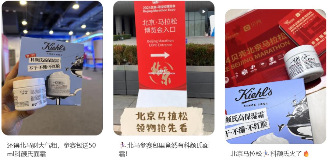 2024年,雅诗兰黛率自家知名的DW持妆粉底液赞助上海女子半程马拉松,主打“持妆不假妆”,往参赛包里塞了三个DW粉底液小样;同年,科颜氏赞助北京马拉松,50ml面霜成了参赛包里的绝对C位,很多人看到这市价三百多的面霜已经觉得200元报名费赚回来了,直夸科颜氏和北马“豪横”“大方”“会推广”。