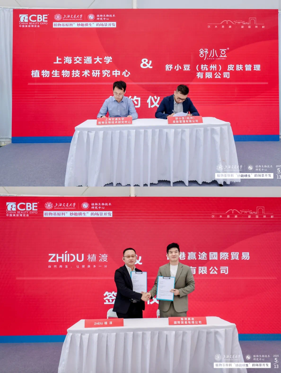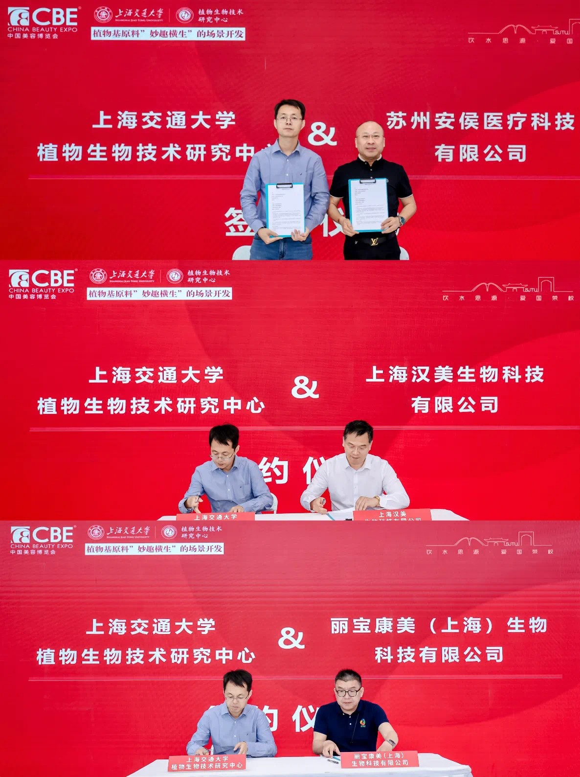 论坛现场举行了多场签约仪式,包括上海交通大学植物生物技术研究中心与舒小豆、香港赢途國際貿易有限公司等企业的合作;上海交通大学植物生物技术研究中心的的科普平台「植渡」与香港赢途國際貿易有限公司;上海交通大学植物生物技术研究中心与丽宝康美(上海)生物科技有限公司和苏州安侯医疗科技有限公司的合作。这些签约标志着各方将在植物基原料研发、场景应用与市场推广等方面展开深度和多维度立体式合作,整合资源,共同推动产业发展。