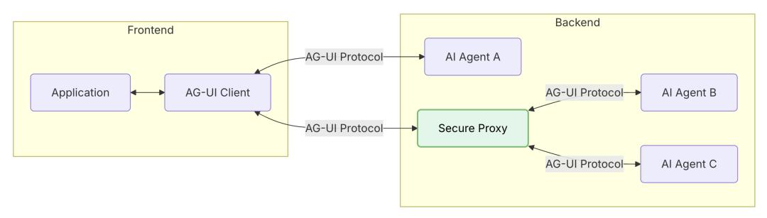 在官方给出的示意图中,可以看出来AG-UI这个协议,就是嵌在应用和后端Agent之间的。如果没有AG-UI协议支持,在下图中应用就是直接跟AI Agent连接的。