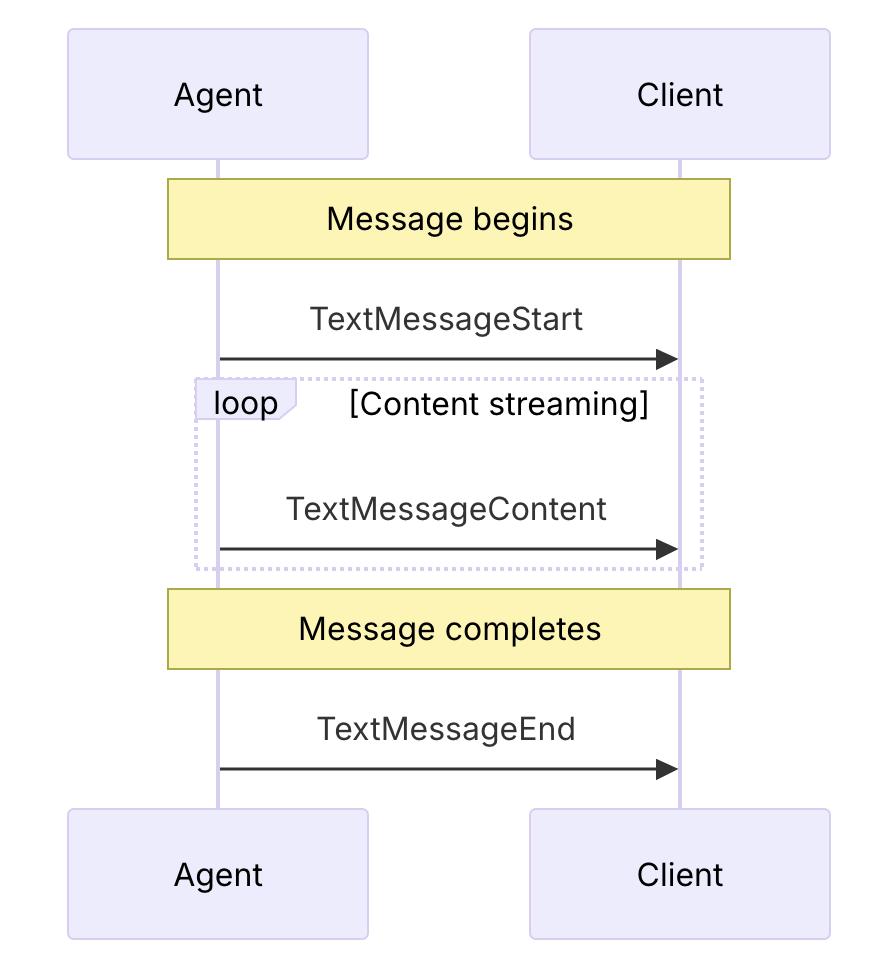 当Agent要生成并传递文本信息的时候,首先以TEXT_MESSAGE_START事件开始,中间是一个或多个TEXT_MESSAGE_CONTENT事件,最后以TEXT_MESSAGE_END结束。