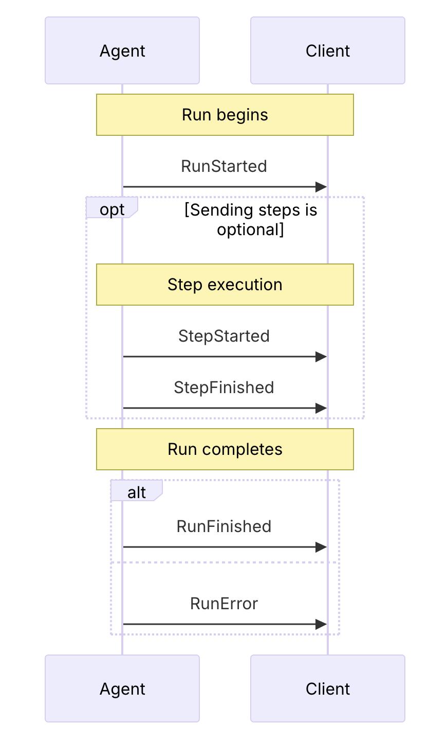一个标准的Agent调用会由RunStarted事件开始,中间可能包含很多个步骤,这些步骤用StepStarted/StepFinished来标识,最后由RunFinished(成功)或者RunError(失败)事件结束。