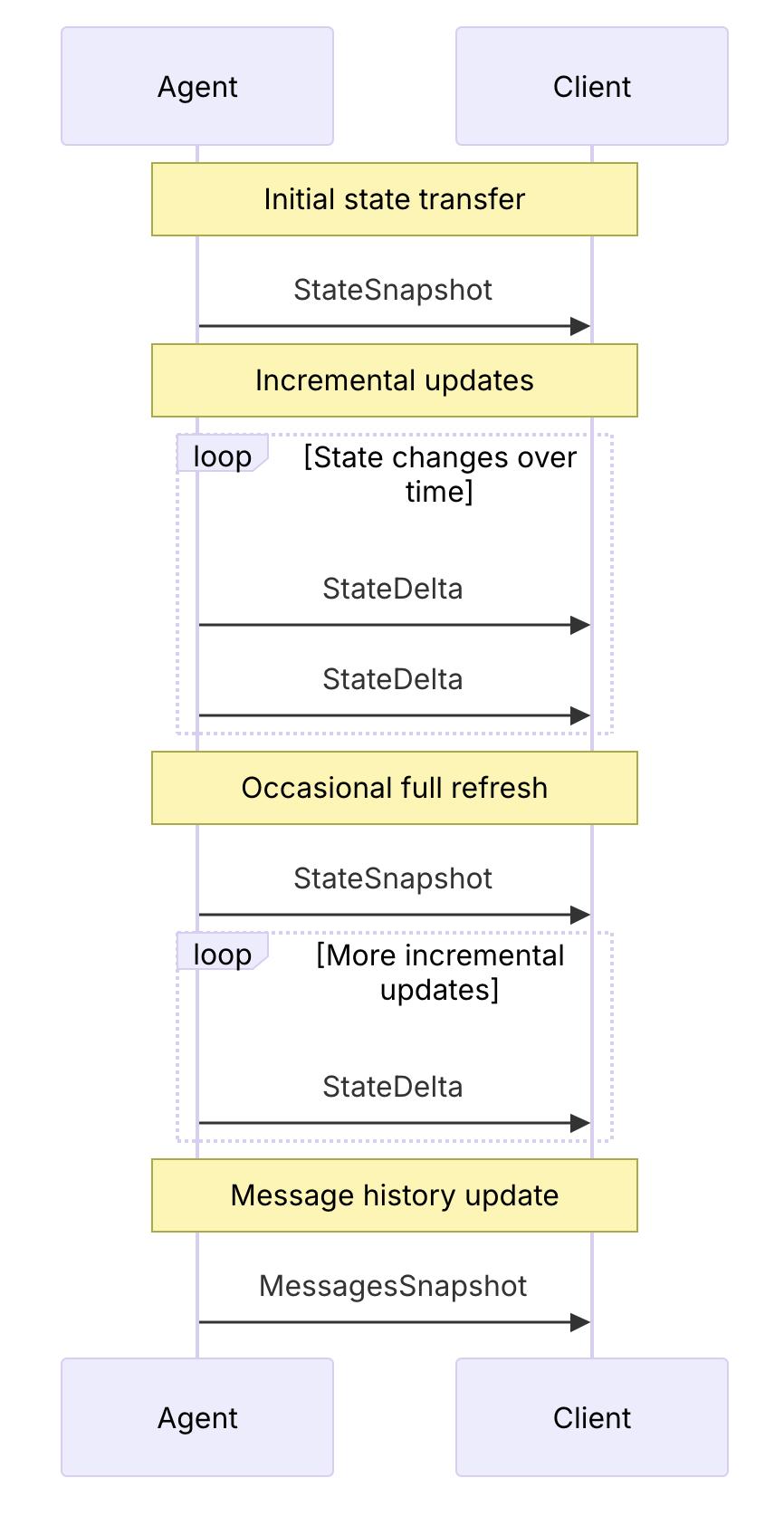 STATE_SNAPSHOT提供Agent在某个瞬间的完整状态,如果状态有更新,就用STATE_DELTA传递更新的部分状态。