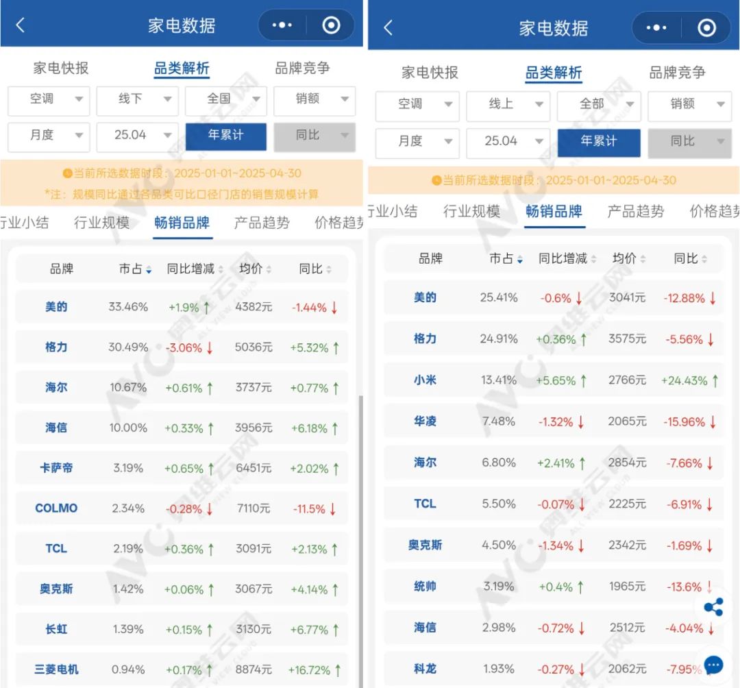 2025年1-4月,空调市场市占率线下及线上渠道前十名 / 奥维云网截图