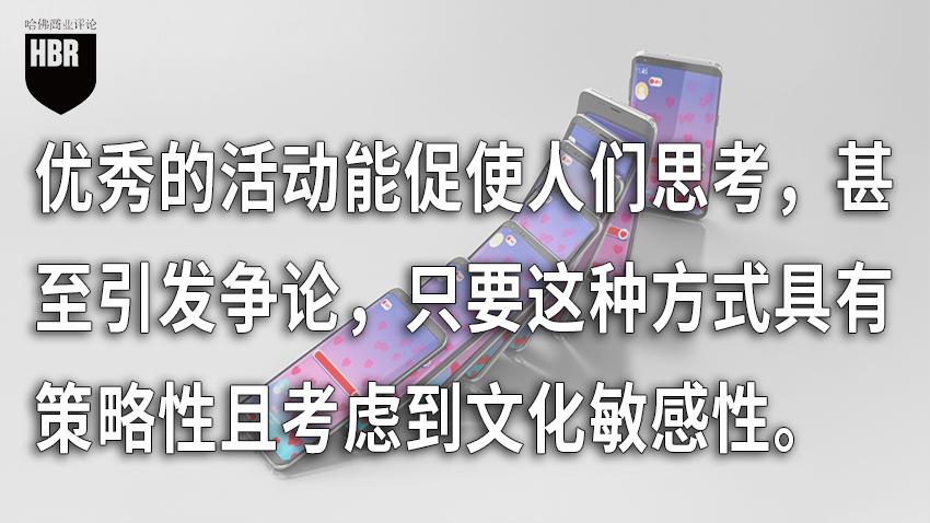 优秀的活动能促使人们思考,甚至引发争论,只要这种方式具有策略性且考虑到文化敏感性。具有启发性的内容会挑战常规、让观众感到惊讶或激发好奇心,而好奇心是人类分享行为的一个已知驱动因素。巴塔哥尼亚(Patagonia)的“别买这件夹克”活动就是另一个典型例子,它敦促消费者重新考虑过度消费问题,同时也与该品牌倡导可持续发展的使命相契合。