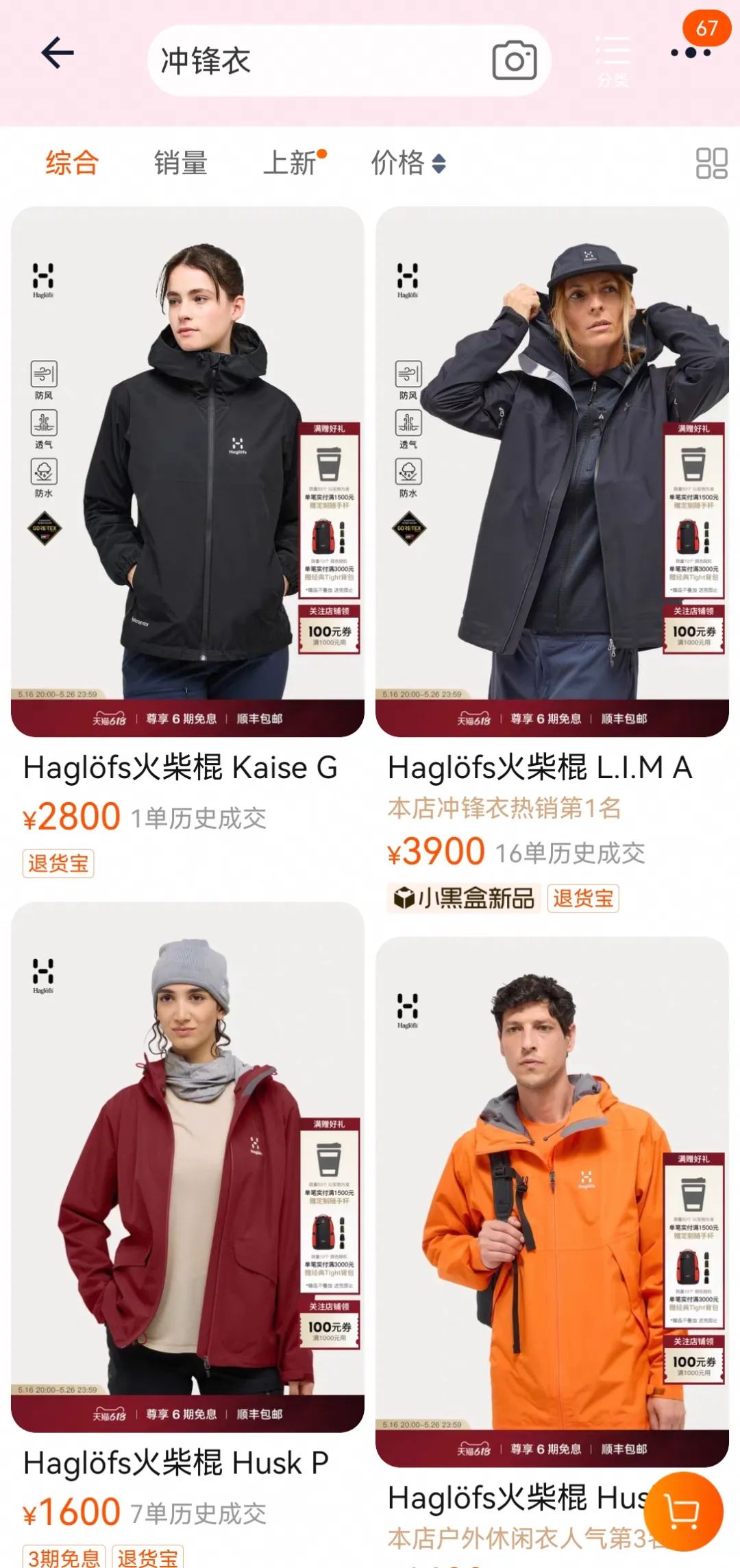 中新经纬在Discovery Expedition天猫旗舰店看到,店内的冲锋衣价格在1015元至2900元之间;Haglöfs天猫旗舰店冲锋衣在1600元至5900元之间。Norrøna价格在349欧元至1199欧元之间,约人民币2800元至9600元。从价格来看,回归品牌以中高端为主。