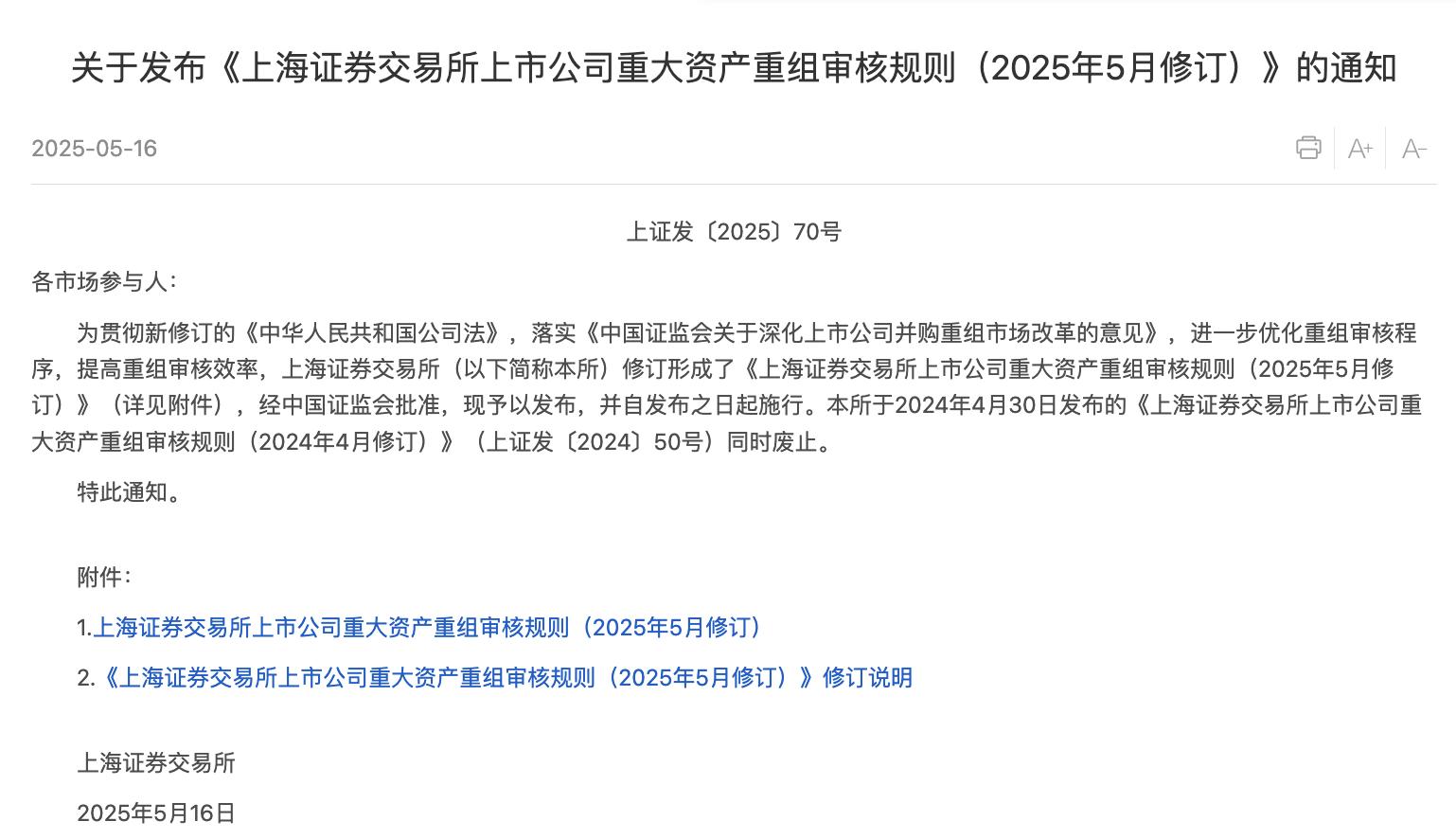 上交所表示,下一步,将以本次规则修订为契机,做好改革的落地衔接,组织开展制度规则培训,加大申报前咨询沟通服务力度,进一步提升重组审核效率,提升监管包容度,同时持续加强监管,引导交易各方规范开展并购重组活动。