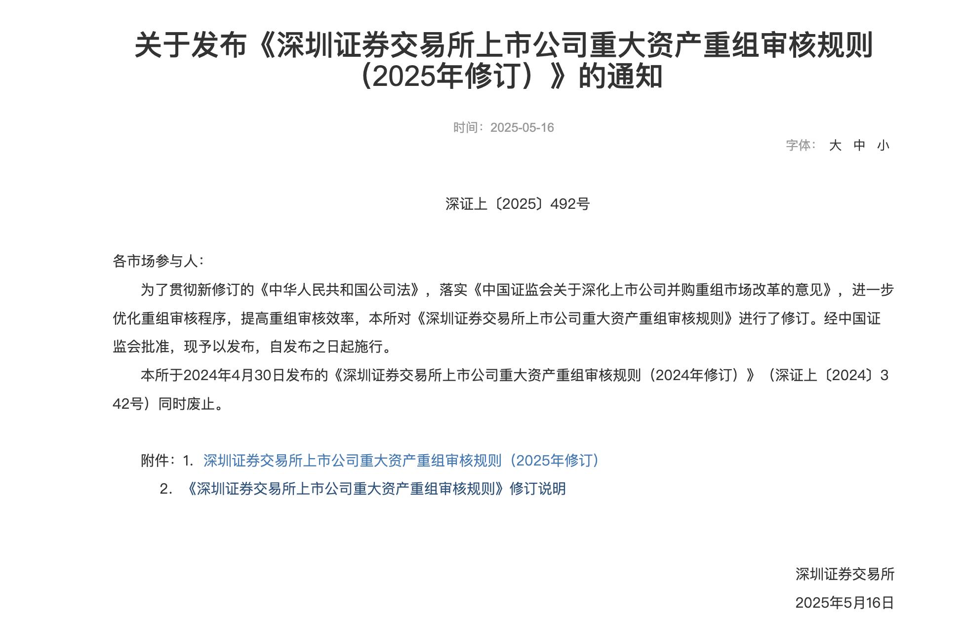 5月16日,中国证监会修改《上市公司重大资产重组管理办法》(以下简称《重组办法》)。同日,沪深北交易所发布了新修订的《上海证券交易所上市公司重大资产重组审核规则》《深圳证券交易所上市公司重大资产重组审核规则》《北京证券交易所上市公司重大资产重组审核规则》(以下简称《重组审核规则》)和配套业务指南。