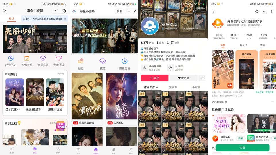 (从左到右依次为:“章鱼小剧场”微信小程序、抖音小程序、抖音端原生账号以及“海看剧场” APP)