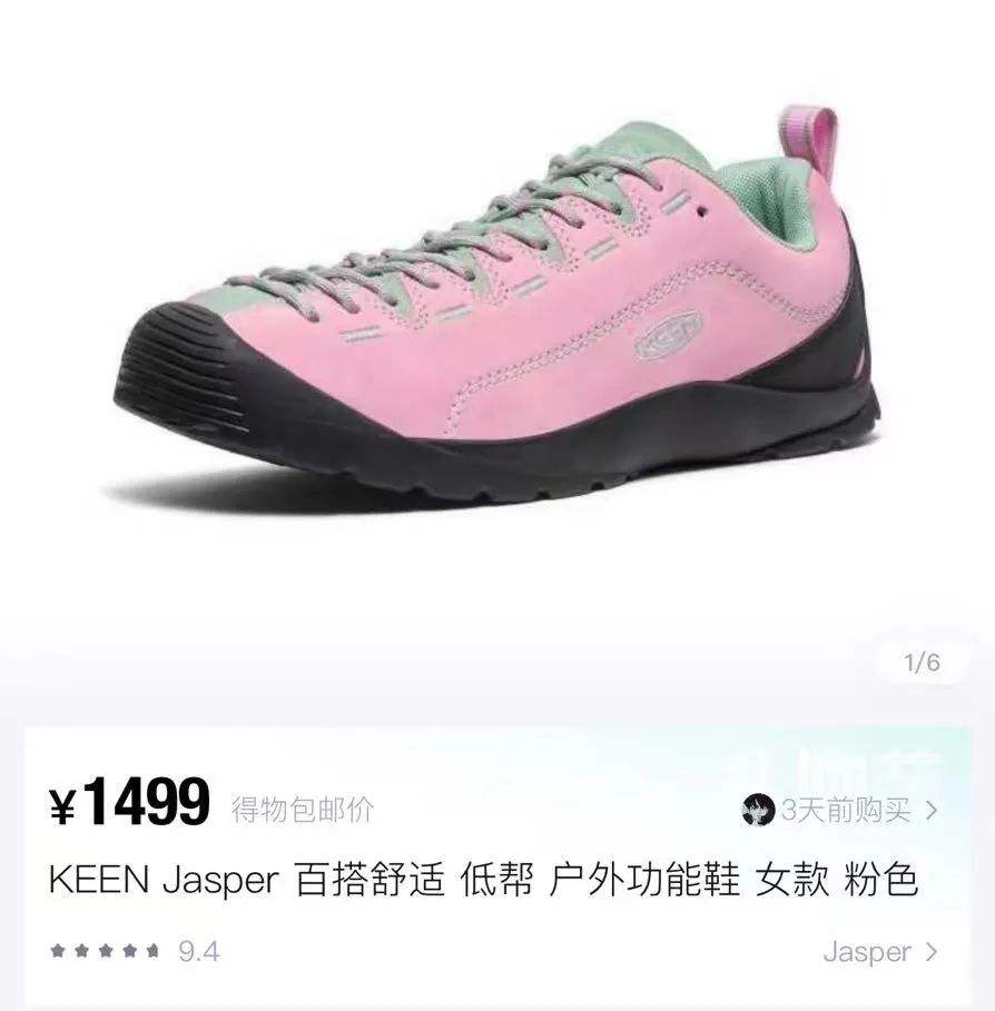 追求个性的,会选更加鲜艳的配色。在KEEN天猫旗舰店,以38码为例,除基础款卡其色和棕色外,其余颜色全部断货。在得物,粉色JASPER价格1499元,溢价约500元。