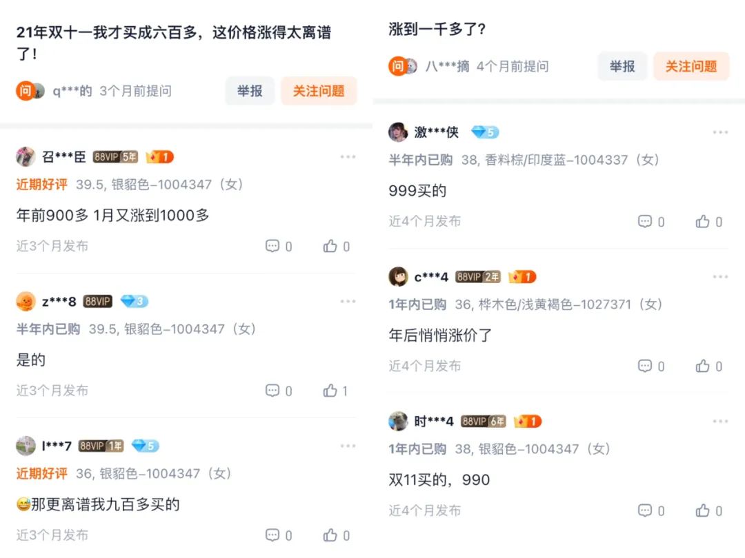 以其天猫旗舰店销量第一的JASPER为例,天猫旗舰店售价1059元。提问区有消费者表示,2021年双11才卖600多,2024年900多,1月涨到1000多,价格涨得太离谱了。而在日本,社交媒体上多位博主表示,JASPER到手价格约700元。在得物,JASPER价格多在700元—800元价格区间。
