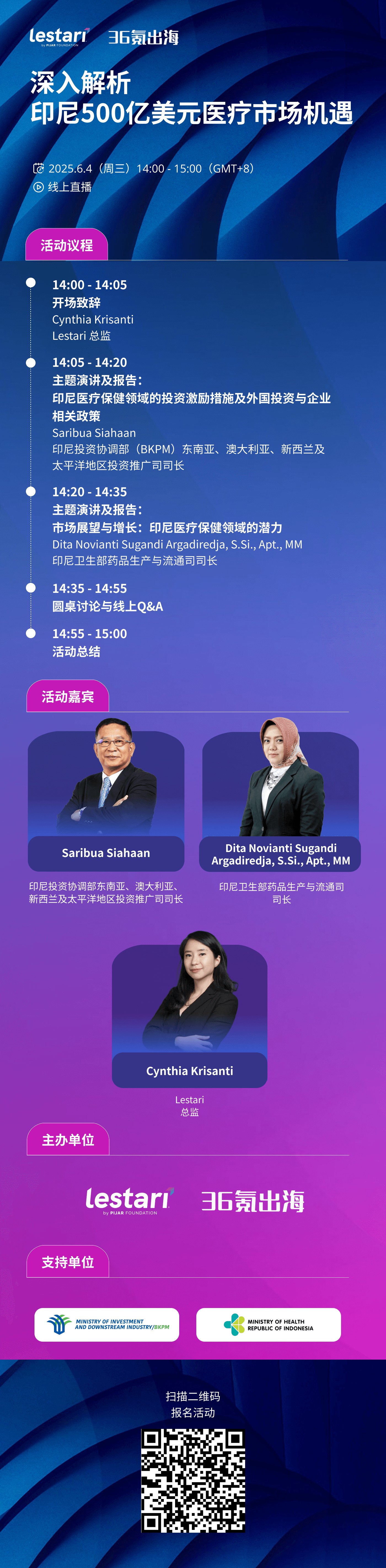 为助力中国企业更好地把握印尼市场机遇,36氪出海将携手印尼市场拓展与创新服务平台 Lestari 推出系列主题活动。首场活动于6月4日下午2:00在线上举办,将聚焦印尼500亿美元医疗市场,邀请印尼政府代表解读医疗行业增长潜力及政策激励措施,为出海企业提供深度市场洞察。