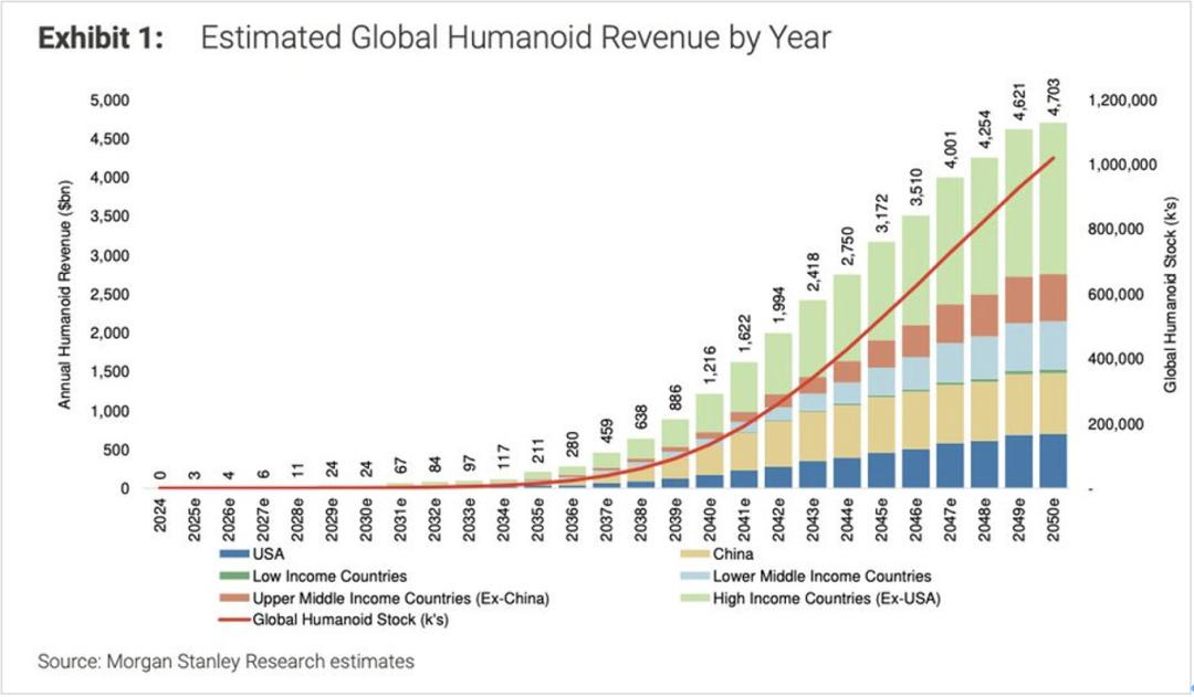 但按照大摩预测,人形机器人达到10亿台的市场规模,要等到2050年。凯恩斯那句“长远来看我们都死了”,含金量还在提高。