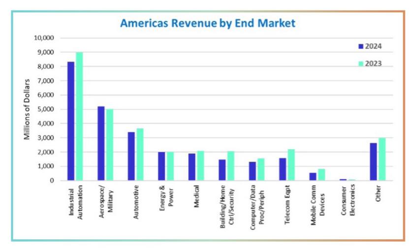 根据ecia的统计,2024年全球范围内50家美国电子元器件分销公司的营收从2023年的1265亿美元降至1240亿美元,降幅为 2.0%。这些公司在美洲地区总销售额从 2023年的314亿美元降至285亿美元,跌幅达 9.3%。