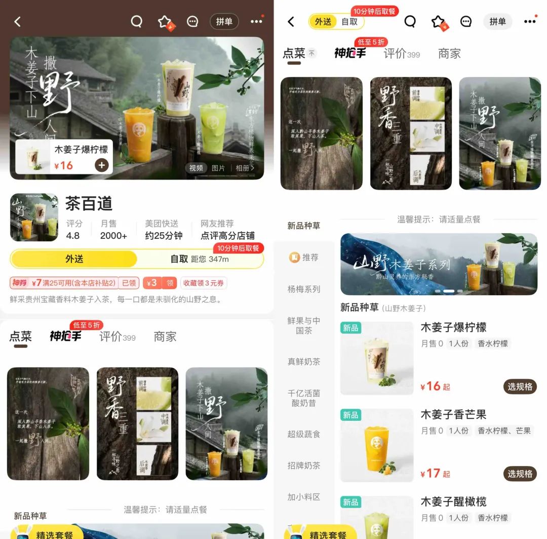 从logo设计到页面布局,品牌的所有门店都保持着高度一致的视觉体系,才会让用户一眼就能识别出品牌的定位和品牌调性。同时,品牌还会充分利用各种能够呈现图片的位置,在日常直接突出“收藏门店领取福利”的字样,巧妙引导用户收藏门店,增强用户粘性;还可以在新品上市时,整体更换相关海报去推广。比如近期茶百道在推广木姜子系列新品,就更新了所有门店的视觉呈现,店铺首页也有新品海报,形成了很强的记忆点。