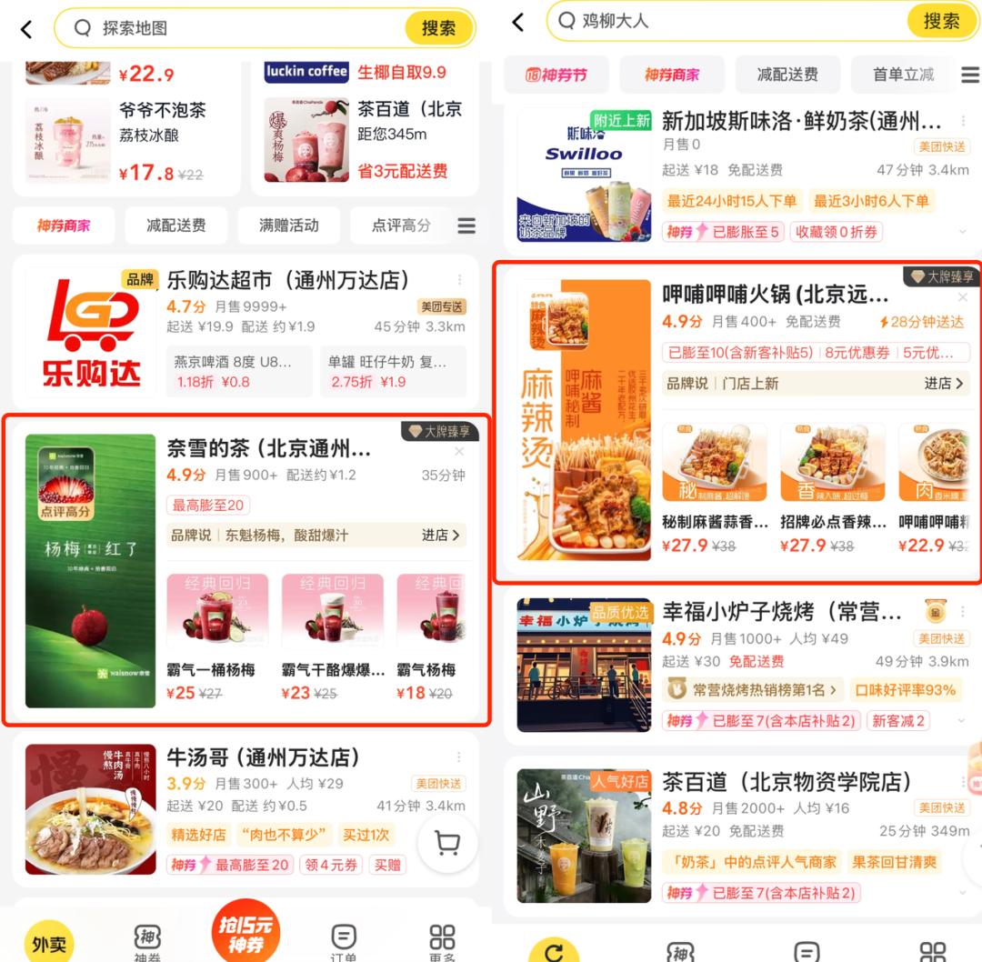 但这只是常规操作,商家常态化投入,能保持效果但不会带来太多增长惊喜。所以平台现在开始为连锁品牌打造更多有“特权感”的资源。比如美团上被连锁品牌“承包”的广告呈现形式——大牌臻享,固定在列表第二位,展示面积更大,还突出展示了主推商品、高分店铺、品质认证等标识。