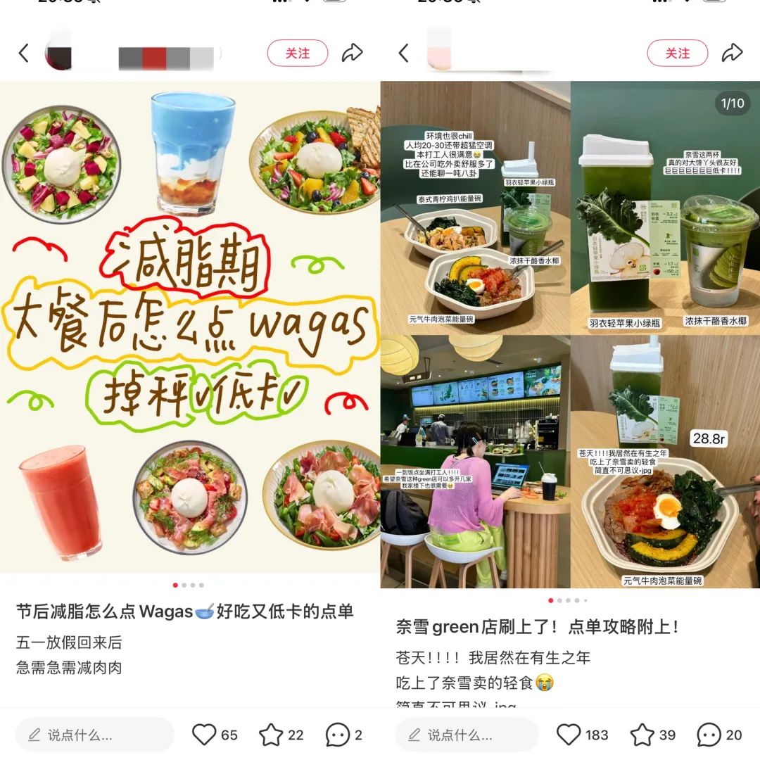 很多餐饮品牌也是通过减脂减重等内容展开营销,通过持续和营养师和健身博主合作,在目标人群中可以建立"减脂首选"的认知,复购率显著提高。比如在小红书搜索“减脂外卖”,就能刷到奈雪的茶、wagas、赛百味、袁记云饺等不少连锁品牌的推广内容。