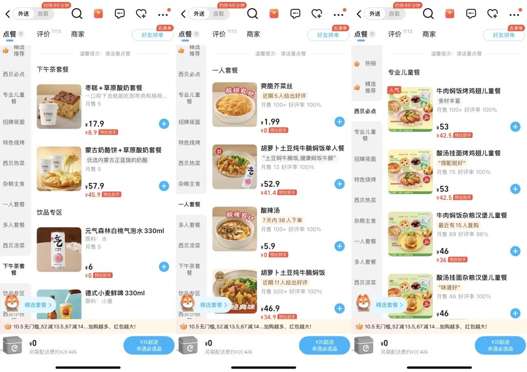 比如西贝莜面村,是将线下受欢迎的招牌菜如西贝面筋、土豆胡萝卜牛腩等针对外卖场景重新设计为一人食套餐,另外还有儿童餐、下午茶套餐等等。这种基于场景的产品设计,既保留了品牌特色菜品,也方便了用户。