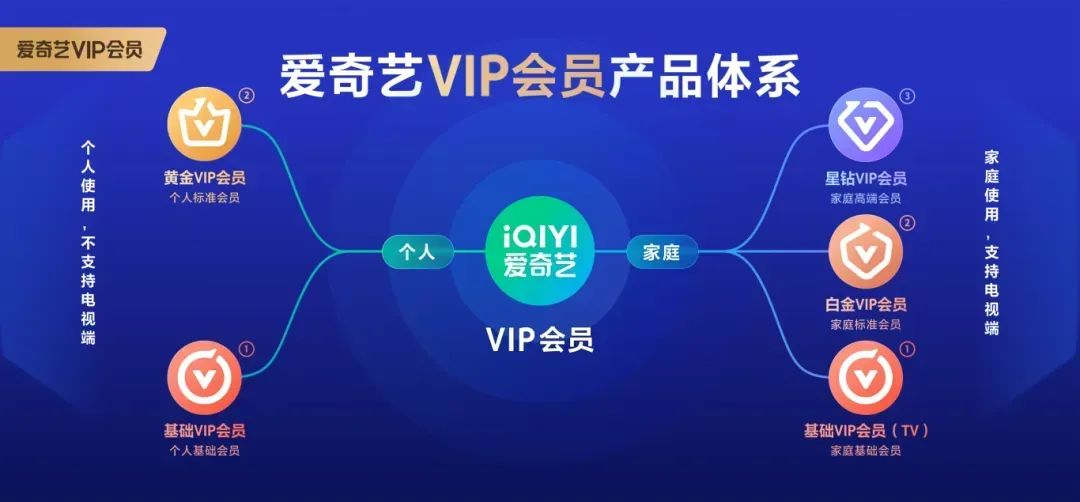 目前爱奇艺的会员产品分为基础、标准、高端三个层级,有5款会员产品,包括个人基础会员(带广告)、黄金会员和面向家庭的基础TV会员、白金会员、星钻会员。其中,黄金和白金会员作为面向个人和家庭的标准产品,是爱奇艺用户订阅的中坚主力产品。
