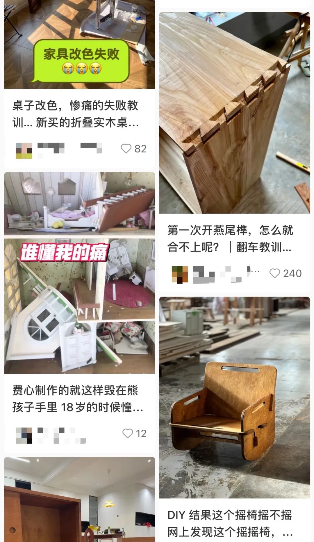可惜 , 空间想象力不是谁都有的 。 有人 预先打 好的海 洋板接口不匹配,导致茶几的台面和桌腿 “ 各有各的想法 ”; 也有人把连接轴装错方向,做出一台只能向内 开门的柜子 ; 更容易翻车的是那些多放一盆花就会侧翻的光轴花架 …… “ DIY 失败 实录 ” 比比皆是 , “劝退 帖 ”的评论区,无数期望成为“当代鲁班”但迅速失败的网友们在进行自嘲狂欢。