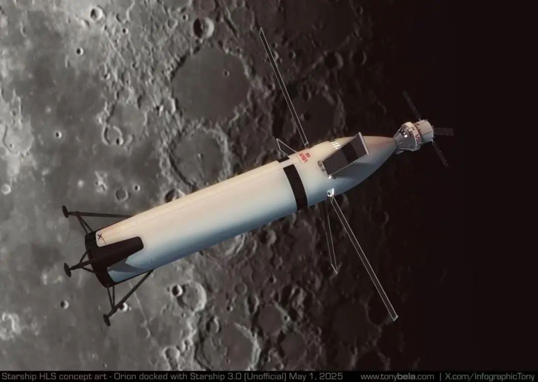 星舰作为登月舱(左)与猎户座飞船(右)对接的CG图 | Tony Bela