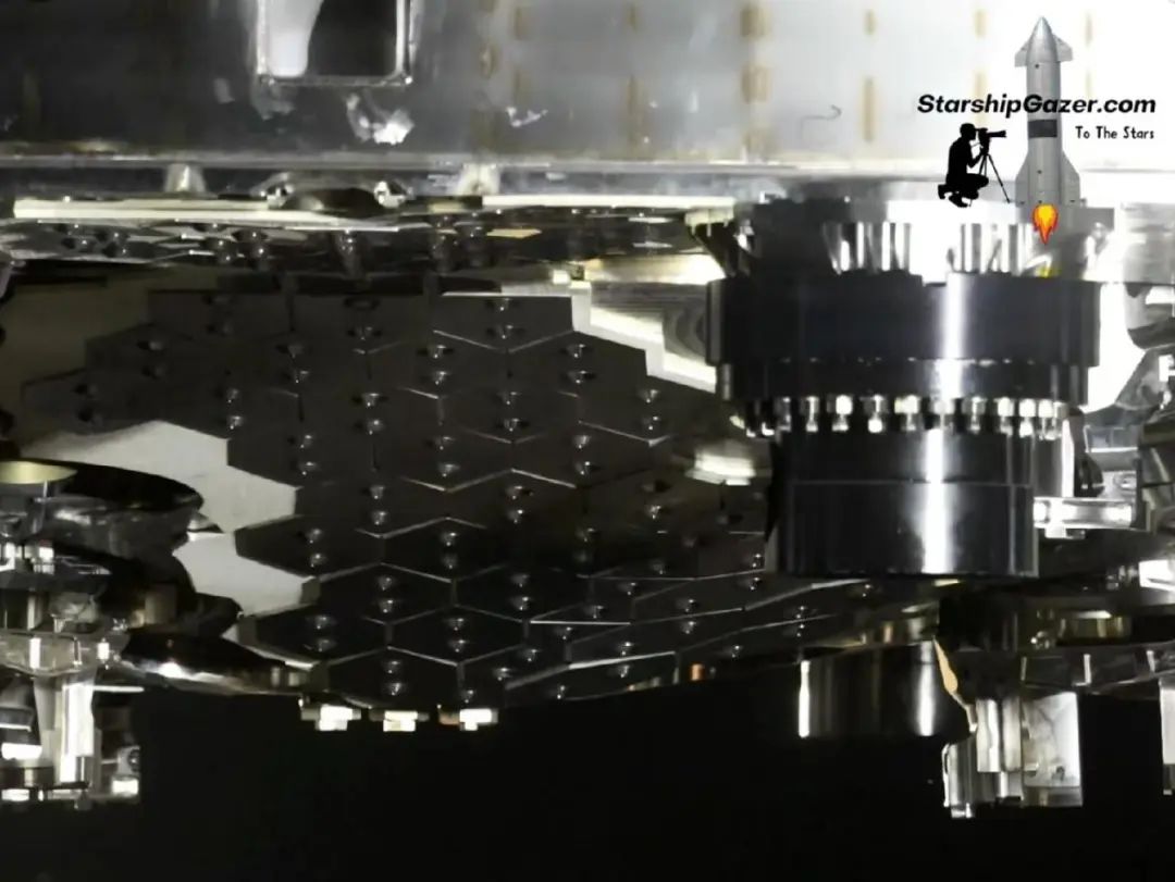 星舰第八飞后网传的图片(上图),与正常情况(下图)相比,S34尾部多台发动机喷嘴缺失 | SpaceX