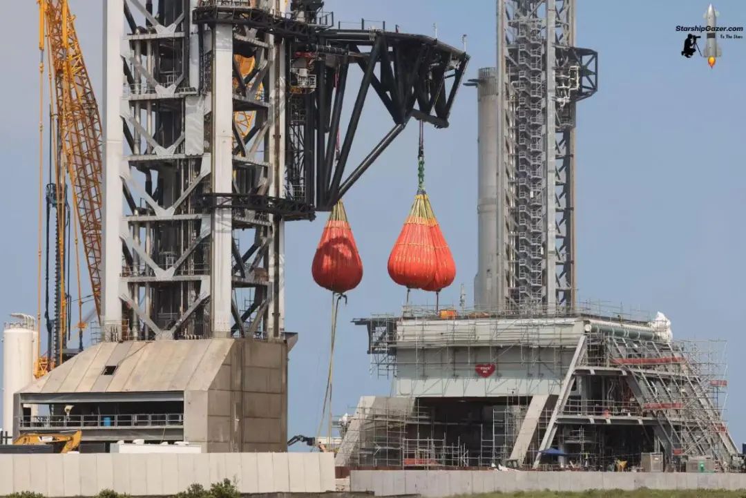 最近,二号发射台的“短筷子”已经安装完成,并进行了载重测试。工人们给它挂上了四个装满水的巨大袋子,每个都重达100多吨,以模拟抓住火箭时的巨大负载 。测试看起来进展顺利 。